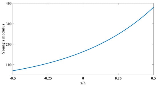 The variation of the Young’s modulus through the thickness of the E-FGM beam is shown in Figure 2.