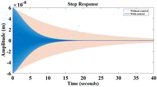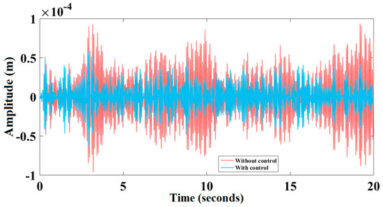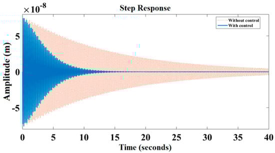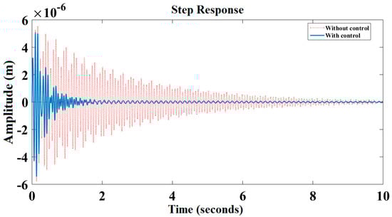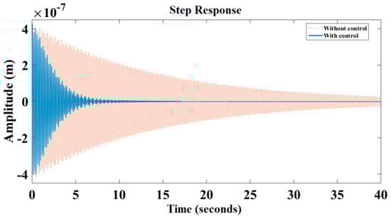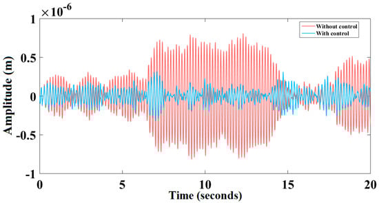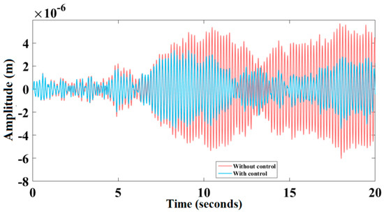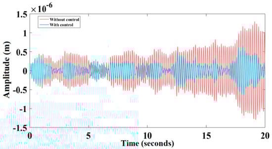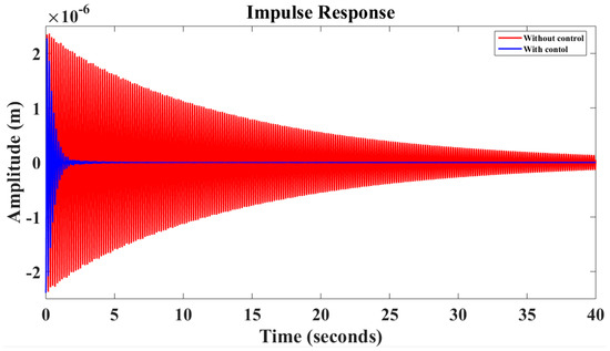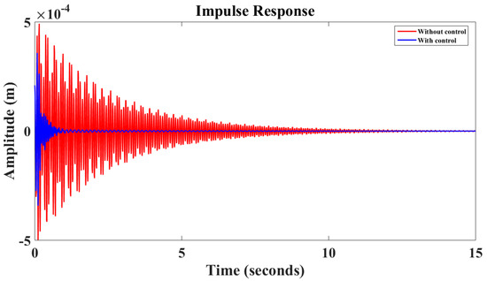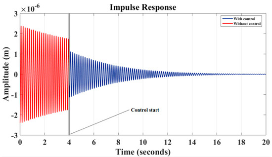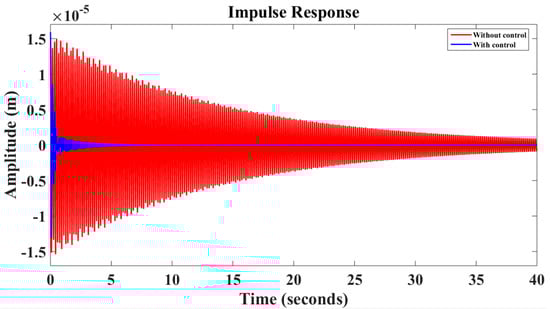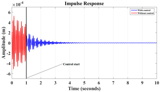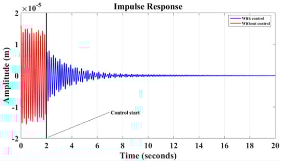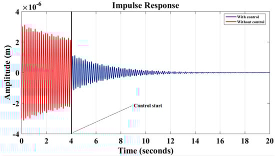 Figure 3, Figure 4, Figure 5, Figure 6, Figure 7, Figure 8, Figure 9, Figure 10, Figure 11, Figure 12, Figure 13, Figure 14, Figure 15, Figure 16, Figure 17 and Figure 18 show the impulse, step, and white noise responses of the beam by varying the sensor pair’s location from the finite element 1 to the finite element 4, and keeping the actuator pair in the finite element 5. Figure 3, Figure 7, Figure 11 and Figure 15 show the application of the active control procedure after a duration lengths of (four, two, and one second), against the Figure 4, Figure 8, Figure 12 and Figure 16, show the comparison between the controlled and uncontrolled impulse response of the beam. Figure 5, Figure 9, Figure 13 and Figure 17 present the controlled and uncontrolled step response. Figure 6, Figure 10, Figure 14 and Figure 18 show the controlled and uncontrolled white noise response of the beam, with increasing the weight matrix Q against R = 1 remains constant in all different figures.