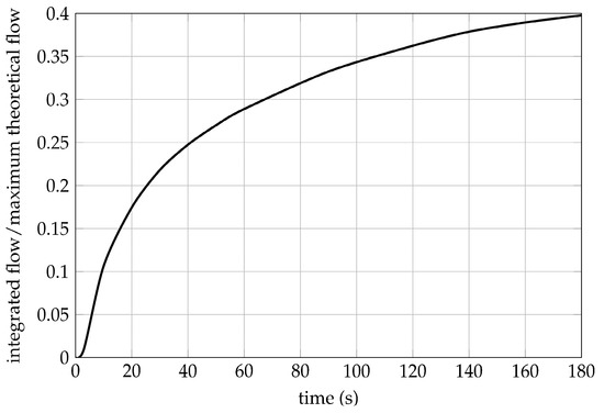 The flow capacity per battery mass depends on several factors like the type of compressor, the working pressure, and the type of battery. Higher pressures generally yield reduced flow capacities per battery mass and vice versa, as summarized in Table 1. Because the mass and volume of the compressor are unchanged, the flow capacity of the entire system can be increased by increasing the battery capacity. In the experiments presented in [23], a compressor with a mass of 500 g was driven by a battery with a mass of 860 g; the results are listed in Table 1. The flow capacities were calculated with Equations (9) and (10) from the respective masses and the flow volume at atmospheric pressure.