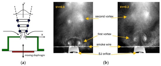 As is known, a synthetic jet (SJ) is generated by the periodic motion of an actuator oscillating diaphragm (for a schematic view, please see Figure 1a). An SJ is synthesized by interactions within a train of vortex rings or counter-rotating vortex pairs in axis-symmetric or two-dimensional geometry; see [,]. Vortex rings that are formed at the lip of the orifice (see Figure 1b) move from the actuator orifice with velocity, which must be high enough to prevent their interaction with the suction force in the orifice. These vortexes dissipate, and the SJ has the characteristics of a conventional steady jet downstream from the orifice (approx. 8D []). One of the main advantages of an SJ is that the time-mean mass flux of the oscillatory flow in the orifice is zero; therefore, the requirement of a blower and piping for the fluid inlet is eliminated. Even though the time-mean mass flux in the orifice is zero, the momentum of the resultant SJ at a specific distance from the lip is non-zero [,,,]. To reach the highest efficiency of an SJ, the actuator should work at the resonance frequency [,,,]. The frequency response of a double-orifice SJ actuator is investigated in [].