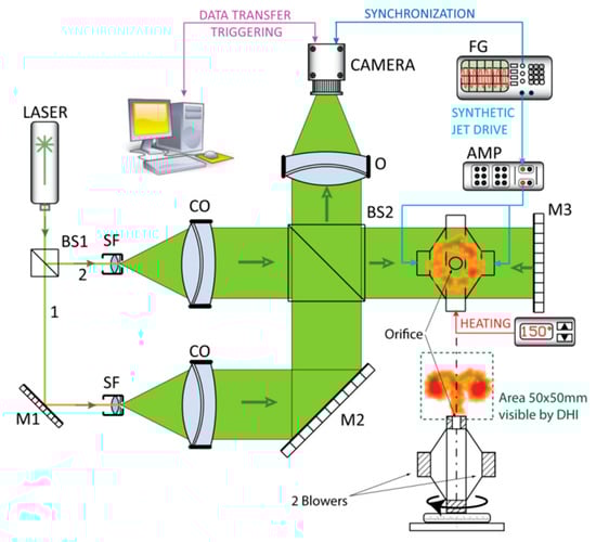 As the synthetic jet is a non-symmetric (for this prediction, the SJ actuator configuration in Figure 3b is supposed) periodic non-stationary phenomenon, DHI experiments of SJ temperature fields were performed by using a tomographic approach.