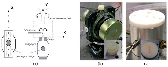 To investigate the SJ temperature field, two types of SJ actuators were used. Both of these types consisted of a sealed cavity, an upwardly oriented outlet orifice, and two loudspeakers (ARN-100-10/4) (DD = 94 mm) working in phase, which are used as moving diaphragms. The loudspeakers were fed with 1.5 W power. In-phase working loudspeakers have the same direction of movement, which ensures that the fluid is sucked into the SJ actuator during the first part of the period, and extruded in the second part of the period. The whole process is cyclically repeated. The first type of SJ actuator had a single orifice with a diameter D = 5 mm; the second type had two orifices with a diameter D = 2 mm each; the spacing between axis of these orifices was 7 mm. The working frequencies of the first and of the second actuator were 15 Hz and 8 Hz, respectively. A schematic view of both SJ is visible in Figure 3. Figure 3b shows the details of the output orifice of the second actuator SJ. For the tomographic approach validation (described in Section 4.2), the continual nozzle with three output orifices (with a diameter of 3 mm each) was used (Figure 3c). The distance of the adjacent nozzle axes was 12 mm.