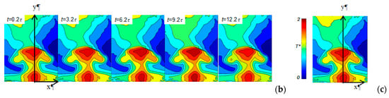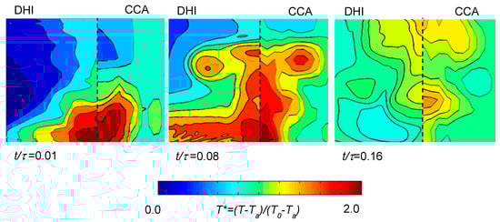 2D DHI is used for a case of the SJ actuator with one output orifice operating at 15 Hz. The left sides of Figure 5 show the development of temperature fields measured with DHI. In this figure, a non-dimensional temperature T* is defined as T* = (T − Ta)/(T0 − Ta), where T is the temperature of the liquid exhausted from the orifice, Ta is the ambient temperature, and T0 is the average temperature in the SJ actuator.
