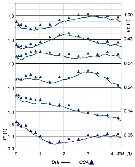 Temperature field of heated SJ over different t/τ. It has to be noted that the CCA is a point measurement, and that the probe was traversed in the plane x–y, i.e., z = 0, with a step of 1 mm. On the other hand, DHI allows for profile measurements in one moment, and profiles are obtained as mean values along the z-axis.