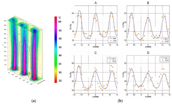 The measurement of steady flow is not as complex as the measurement of dynamic phenomena, and it can easily reveal weak points of the tomographical approach. Therefore, steady flow was used for the first experimental validation of the method. A non-symmetrical temperature field of heated air flowing out from a three-orifice system was measured (Figure 7a). As a reference, DHI results were compared to well-characterized and traceable CCA (constant current anemometry) measurements. CCA is a one-point method, and therefore, we have selected several representative points within the measured area. CCA measurements were performed along horizontal lines at different heights. The results at different heights (5 mm, 10 mm, 20 mm, and 40 mm) are denoted by the letters A–D, and these are shown in Figure 7b. The distance of the CCA measurement step in the horizontal direction was 1 mm. DHI is the full-field method, so that voxels from the measured temperature distribution corresponding to the position of the measured CCA values were selected. 1D graphs marked A–D present the results obtained by DHI and CCA along the horizontal cuts, with the same position for both types of measurements. The root-mean-square deviation at all of the measured points was calculated to quantify the difference between the results obtained from both methods. The RMS value was 3.8 °C, which can be considered as a measurement match within a range of about 12%. The main contribution to the measured discrepancies in DHI and CCA results is probably the fact that both measurements had to be done separately at different times, due to the invasive features of CCA. Despite the inconsistencies mentioned, the consensus is good, and it can be stated that DHI provides comparable results as the established CCA.