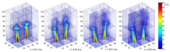 A tomographically reconstructed 3D temperature field of SJ, measured over different times. The period of SJ was set to τ = 125 ms.