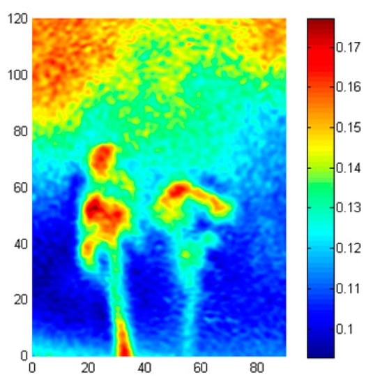 where and N is the number of averaged phases (N = 20 in our case). The fluctuation component of the temperature field described by the standard deviation is less than 17%. For the measurement, it is assumed to be a coherence of the phenomena. The fluctuation map represents the correlation of the temperature distribution between different periods. The fluctuation map for a fully coherent phenomenon would approach zero, while for stochastic temperatures, the field goes to 1.