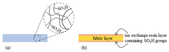 Nafion- and Selemion CMV-based IPMCs were fabricated. Both contain -SOH atomic group, but their structure is different from each other. The entire Nafion body consists of the random network of fluorocarbon chains bearing -SOH groups as illustrated in Figure 1a. The main body of Selemion CMV is the hydrophobic polymer fabric and the fabric surface is coated with ion exchange resin containing -SOH as in Figure 1b.