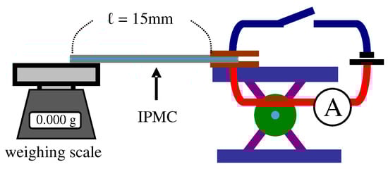 One end of the S-Naf was horizontally clamped with a pair of electrodes, and the tip was placed on the stage of a weighing scale as illustrated in Figure 3. The weighing scale acquired the blocking force generated by the downward bending of S-Naf under the constant voltage 2 V as a function of time, and simultaneously, the current induced was measured. Next, the blocking force generated by S-Naf under the constant current (not constant voltage) of 0.1 mA was measured as a function of time.