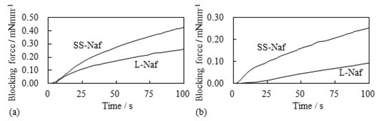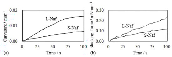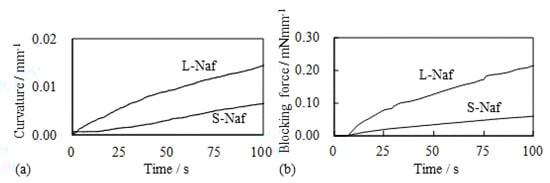 The time dependence of the bending curvature of S-Naf and L-Naf under 2 V is shown in Figure 4a, where the absolute humidity (AH) is given in the captions of individual diagrams from now on. The bending curvature of L-Naf is greater than that of S-Naf, despite the rigidity of L-Naf being greater than S-Naf because of their thickness difference (see Table 1). Figure 4b shows the time dependence of the blocking force of S-Naf and L-Naf under 2 V. The blocking force of L-Naf is also greater than that of S-Naf. The silver redox reaction took place for the measurements shown in Figure 4a,b, since the imposed voltage was greater than V (= 0.7 V).