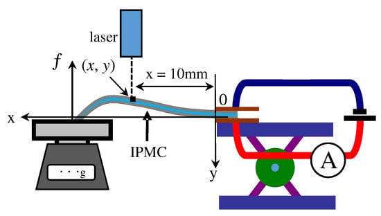 Coordinate system set on the IPMC. f: Blocking force; (x, y): A coordinate set of the representative point of IPMC.