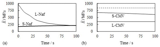 (a) (representative value of Young’s modulus) of S-Naf and L-Naf under 2 V; (b) Solid lines: of S-CMV and L-CMV under 1.5 V. Dashed line: L-CMV obtained by employing the corrected moment of inertia of area. AH ∼ 10 gm.