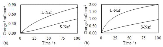 For the purpose of quantitatively evaluating the IPMC rigidity, the actual IPMC bending stiffness needs to be obtained. Since the IPMC is not structurally homogeneous, its Young’s modulus cannot be defined strictly speaking. Nevertheless, the moment of inertia of the area of the IPMC must basically be constant during bending. Hence, the bending stiffness can be approximately represented by where and I are the representative value of Young’s modulus and the moment of inertia of the area of IPMC, respectively. Therefore, we can regard that the evaluation of is equivalent to the evaluation of bending stiffness of . The representative value of Young’s modulus, , can be evaluated using the time evolution of the blocking force, f, and the coordinates of the representative point of the IPMC, (x, y), (see Figure 5). Therefore, we obtained the profile of of the IPMC during the blocking force measurement. The procedure of obtaining is essentially the same procedure developed by Tamagawa et al. [], but we simplified it as explained in Appendix A. Figure 6 represents the vs. Time of individual specimens. Here, L-Naf exhibits a drastic change of over time, while the others do not. Further discussion of behavior is given in the Section 5.1.3 and Section 5.2.1. Next, the charge quantity is evaluated. Figure 7 shows the time dependence of charge generated in L-Naf and S-Naf when the experiments for Figure 4a,b were performed. The charge Q(t) was obtained by numerically computing Equation (1), where the current, I(t), was experimentally measured using an ammeter equipped to the experimental setups (see Figure 2 and Figure 3). For both measurements of bending and blocking force, the quantity of charge generated in L-Naf was greater than that in S-Naf. Hence, it is quite understandable why the L-Naf exhibited greater bending curvature and greater blocking force than S-Naf, even though L-Naf is more rigid than S-Naf.