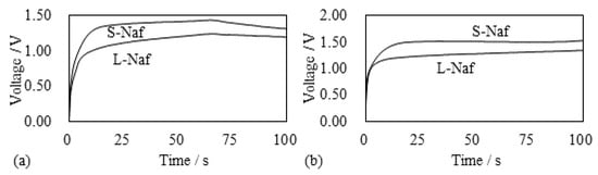 In order to settle the question raised in the previous section, the time dependence of the curvature of S-Naf and L-Naf under a constant current of 0.1 mA was measured, and the result is shown in Figure 8a. L-Naf exhibited a greater bending curvature than S-Naf even under the imposition of the same quantity of charge. The time dependence of the blocking force of S-Naf and L-Naf under the constant current of 0.1 mA is shown in Figure 8b and it shows that L-Naf exhibited a greater blocking force than S-Naf. So, L-Naf, which is mechanically more rigid than S-Naf according to Figure 6a, exhibited a greater bending curvature as well as a greater blocking force. It is understandable that the mechanically more rigid L-Naf generated higher blocking force than S-Naf. However, it is counterintutive that such a more mechanically rigid L-Naf exhibited the greater bending curvature than S-Naf by the impose of same quantity of charge. Figure 9 shows the time dependence of voltage generated when the experiments shown in Figure 8a,b were performed. Virtually, the voltage generated was beyond V for all the experiments. Therefore, silver redox reaction was inevitably induced for all the experiments performed under 0.1 mA current. The occurrence of the silver redox reaction suggests that the variation of the atomic structure of the silver coatings of the IPMC [], and which could result in the change of mechanical characteristics of the IPMC of L-Naf as shown in Figure 6a. Such mechanical characteristics change must have led to the simultaneous enhancement of bending and blocking force generation of L-Naf. Therefore, the use of a corrosive metal like silver as an electrode material is not necessarily unbeneficial to the IPMC performance. The change of the material characteristics of IPMC by using a less stable and corrosive material is one of the strong tools for the improvement of IPMC performance. But why didn’t of S-Naf have as large of a change as L-Naf? In the next section, it will be discussed.