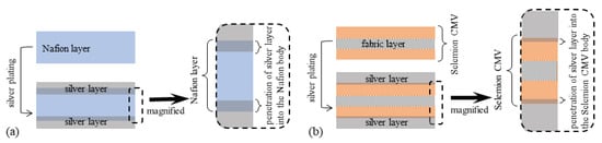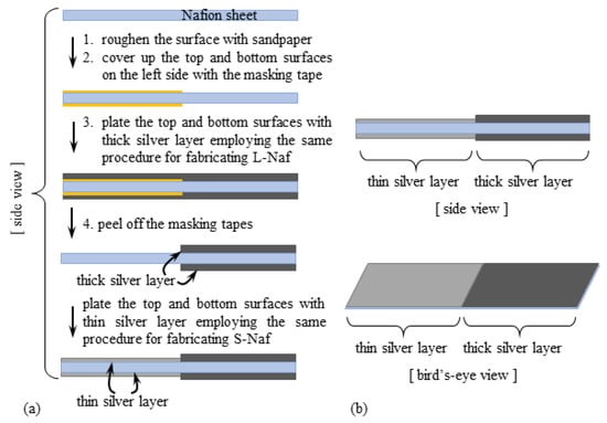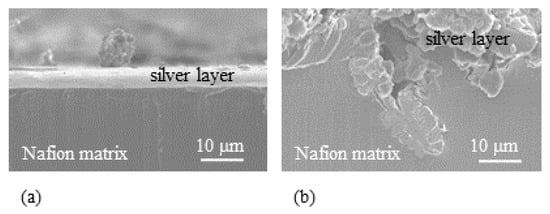 - Experiment (i) Since the averaged thickness of L-Naf is 208 m and that of S-Naf is 188 m as summarized in Table 1, the silver coating of L-Naf is 10 m thicker than that of S-Naf based on the simple calculation (208 m − 188 m) ÷ 2 = 10 m. However, the SEM images in Figure 10 show that the silver layer of L-Naf penetrates a bit far inside of Nafion body, the penetration depth of silver is not included in that 10 m, while the silver layer of S-Naf is formed merely on the Nafion surface.