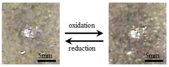 Figure 11. Photos of the L-Naf surface under the induction of redox reaction. - Experiment (iv) The resistivity measurement of the silver coating of S-Naf and L-Naf was performed by the procedure illustrated in Figure 12a. 2 V was imposed on L-Naf for 100 s, then the anode surface resistivity was measured using four probe method as the 1st stage. Next, 2 V was again imposed on the same L-Naf with the reversed polarity for 100 s, and the resistivity of cathode surface (corresponding to the anode surface at the 1st stage) was measured as the 2nd stage. This process was repeated up to the 10th stage. The same measurement was performed for the S-Naf, too. The resistivity behavior of L-Naf is shown in Figure 12b. The data at the odd number stages represents the resistivity of the oxidized silver coating (anode), while the data at the even number stages represents the resistivity of the reduced silver coating (cathode). Clearly, the alternate increment and decrement of the resistivity was observed, which suggests the alternate induction of silver redox reaction. It was also true for S-Naf. Outcomes from the experiments of (ii), (iii) and (iv) suggest that the induction of silver redox reaction on the IPMC surface. What is described in this section suggests that the silver redox reaction is actually induced and it could even lead to the change of mechanical characteristics of the IPMC, . Consequently, such material characteristics change originating from the silver redox reaction could result in the simultaneous enhancement of bending and blocking force generation of the IPMC.