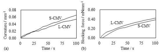(a) Curvature vs. Time and (b) Blocking force vs. Time of S-CMV and L-CMV under 1.5 V. The blocking force was normalized as the blocking force of 1 mm-width IPMC. AH ∼ 10 gm.