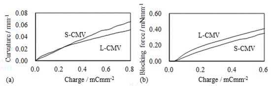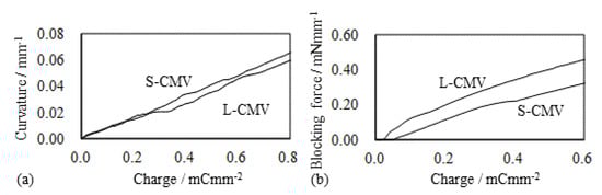Figure 15a,b show curvature vs. charge and blocking force vs. charge of S-CMV and L-CMV under 0.35 mA, respectively. Figure 15a suggests that L-CMV is, as expected, slightly less deformable than S-CMV in response to the charge imposed. On the other hand, the L-CMV generated slightly greater blocking force than the S-CMV. Figure 14 and Figure 15 are interpreted that the rigid L-CMV is slightly less deformable than S-CMV but is able to generate a bit greater blocking force than S-CMV. So, the use of Selemion CMV as a matrix of IPMC does not result in the creation of an IPMC which can simultaneously suffice the exhibition of large deformation and high blocking force generation, even though the large quantity of silver is accumulated on the Selemion CMV surface.