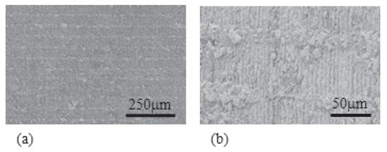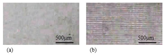 Although it is suggested in the previous section that the formation of a thicker silver coating from the Nafion surface toward the significantly far inside of the Nafion body could result in the quite effective simultaneous bending and blocking force generation, it is not easy to put it in practice. As a trial, we performed the scathing of Nafion surface through the stick-slip micro level surface treatment [,]. Figure 17a shows the non-treated surface of Nafion. Using the stick-slip surface treatment, Nafion came to have a number of micro level grooves as shown in Figure 17b. Notice that those grooves are usually invisibly fine and shallow and it is not clearly visible even by electron microscope. The visible grooves in the optical microscope photo of Figure 17b is owing to the right lighting. The same silver plating treatment for the L-Naf fabrication was performed for this stick-slip surface-treated Nafion. The resulting IPMC is denoted by SS-Naf. Although the grooves formed on the Nafion surface before the silver plating are not so clearly visible by the electron microscope observation, the embedment of silver in those grooves are clearly seen as shown in Figure 18.