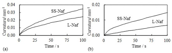 Curvature vs. Time of S-Naf and L-Naf (a) under the constant voltage 2 V; (b) under the constant current 0.1 mA. AH ∼ 12 gm.