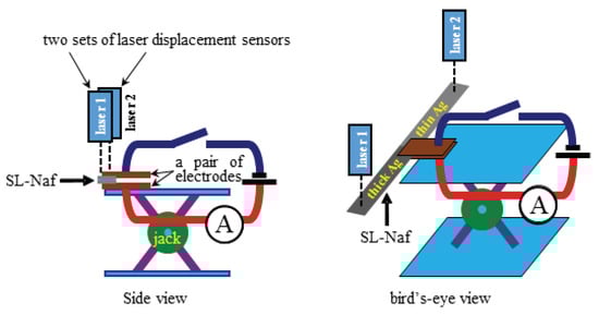 The S-Naf was horizontally clamped with a pair of electrodes as illustrated in Figure 2. Its vertical displacement under a constant voltage of 2 V was measured as a function of time using a laser displacement sensor. Simultaneously, the current was measured using an ammeter. The vertical displacement and current were later converted into curvature and charge, respectively. Next, the vertical displacement of S-Naf under a constant current of 0.1 mA was measured as a function of time.