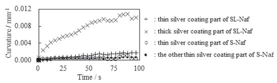 The measured vertical displacement was computed into the bending curvature as shown in Figure 23. The bending curvature of the thick silver coating part of the SL-Naf is greater than that of the thin silver coating part. The bending curvatures of the S-Naf detected by Laser 1 and Laser 2 behaved quite similarly. Furthermore, the bending curvature of thin silver coating part of the SL-Naf represented by the symbol “+” in Figure 23 was quite similar to those bending curvature behaviors of S-Naf represented by the symbols “∘” and “•”, while the bending curvature of thick silver coating part of the SL-Naf represented by the symbol “×” was by far greater than the bending curvatures of the others.