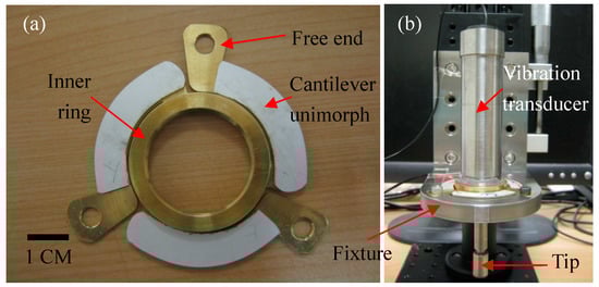 The structure of the piezoelectric energy harvester is shown in Figure 1a. Basically, it has an inner ring, while around the outer rim of the inner ring, three unimorph cantilevers are asymmetrically surrounded. The unimorph was fabricated by bonding the PZT materials on the substrate part of the harvester. The PZT material is PZT-5A from Wuxi Huifeng Piezoelectric Co., Ltd. (Wuxi, China) (d31 = −160 pC/N, k31 = 0.35, εT33 = 1750). The inner ring is machined with the screws, used to couple the high-power ultrasonic transducer to the energy harvester as shown in Figure 1b. At the free end of the cantilever, there are three holes, which are used to fix the energy harvester to the external fixture.