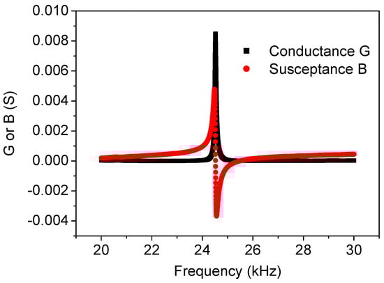 In this configuration, the high-power transducer is the vibration energy source. It works at 24.4 kHz and can be used for ceramic cutting. The energy harvester is connected to the transducer at the location that is the so-called nodal position. Theoretically, the vibration amplitude at this position is zero. However, in practice, there is always vibration leakage at the nodal position due to various reasons, such as imperfect design, frequency change, non-ideal dimensions, and mounting problems. It is this vibration leakage at the nodal position that can be used as vibration energy sources. It is also found that although the nodal position has been used for an energy harvester, the performance of the cutting transducer is almost not affected. This is proved as shown in Figure 2, which is the conductance G and susceptance B frequency spectrum of the cutting transducer. The spectrum is clean, sharp, and with no random noises. Therefore, it implies that the harvester only scavenges the energy leakage, not affecting or deteriorating the performance of the cutting transducer.