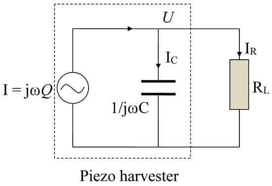 Before experimental studies, the advantages of using high frequency energy sources were analyzed theoretically, using the model as shown in Figure 3 [,,]. In this model, the piezoelectric energy harvester is represented by using a constant charge Q source (non-constant current I). The relation between the charge Q and current I is shown in the figure. Practically, this model represents a piezoelectric energy harvester vibrating at a frequency-independent constant displacement amplitude. From this model, the following relations can be found: