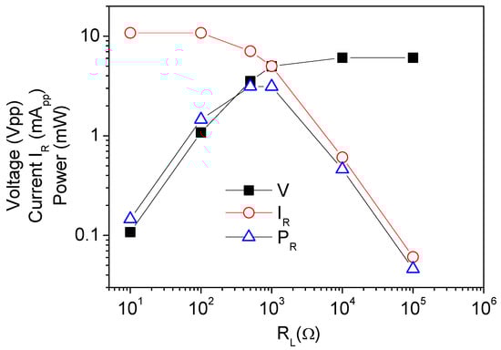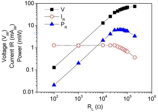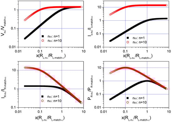 In this relation, the subscript “match” means the impedance matching condition and “max” means the maximum value of the respective parameters (Figure 4). It can be seen that the impedance matching condition is not equal to the maximum output voltage or current condition.