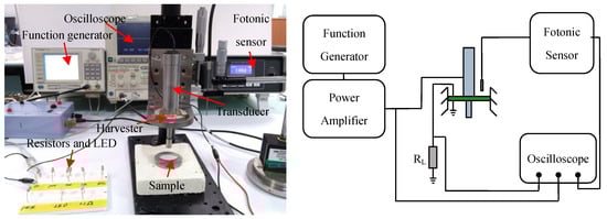 To measure the properties of the piezoelectric energy harvester, a setup was built as shown in Figure 5. In this setup, the piezoelectric cutting transducer was powered by using a function generator (FG300, Yokogawa Electric Corporation, Tokyo, Japan) and a power amplifier (PZD2000, Trek Inc., NY, USA). An oscilloscope (DL1620, Yokogawa Electric Corporation, Tokyo, Japan) was used to monitor the voltage applied to the cutting transducer. Displacement of the energy harvester was measured by using a fotonic displacement sensor (MTI-2100, MTI Instruments Inc., Albany, NY, USA). The obtained signal was displayed on the oscilloscope. The power output capability of the energy harvester was measured by using a series of resistors from 10 Ω to 100 kΩ. The three phases of the energy harvester were connected together, giving a total capacitance of about 10 nF. Its output was connected to the resistor. The voltage across the resistor was measured by using the oscilloscope.
