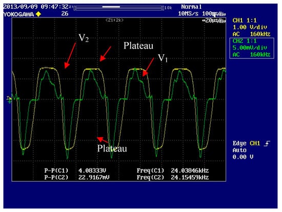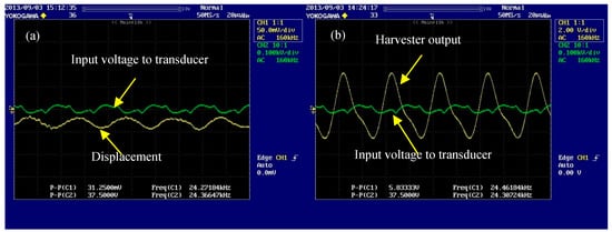 To check whether there is energy that has been harvested by using the developed harvester, the displacement and open circuit voltage of the harvester were first measured. The location for the displacement measurement was at the middle of one cantilever unimorph. The cutting transducer was under free vibration conditions. The signals of the displacement and voltage output were connected to and displayed on the oscilloscope. Figure 6a shows the displacement signal. The input voltage to the transducer is approximately 37.5 Vpp. The driving signal is 24.4 kHz. It can be seen that the obtained amplitude of the displacement is approximately 31.25 mVpp, corresponding to 0.73 μmpp displacement and 0.056 m/s vibration velocity. The detected frequency is 24.36 kHz, which is very close to the driving frequency. This result suggests that the nodal vibration leakage is able to be used as an ultrasonic energy harvesting source. In terms of vibration velocity, the ultrasonic transducer usually works at the velocity range from several m/s to 20 m/s []. This vibration leakage is therefore comparatively very small in amplitude. However, alternatively, this also implies that the harvester can be used as a good vibration isolator [,].