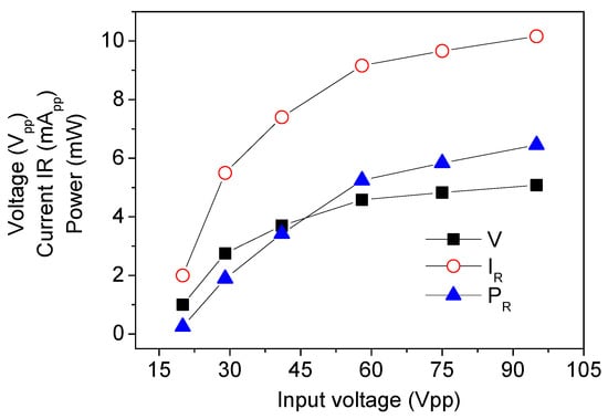 Figure 8 shows the measured output voltage, current, and power as a function of the applied voltage to the transducer. The resistor load is 500 Ω. In theory, an increase in input voltage will enhance the excitation level to the energy harvester. Hence, the voltage, current, and power were observed to increase gradually. However, the increment (voltage and current) is not linear as expected. One of the reasons could be the free vibration condition of the transducer. When the excitation level is increased, the losses and damping might shift the position of the resonant frequency of the transducer. As a result, the magnitude of the vibration is reduced. The maximum observed power, current, and voltage are about 6.4 mW, 10.2 mApp, and 5.08 Vpp, respectively.