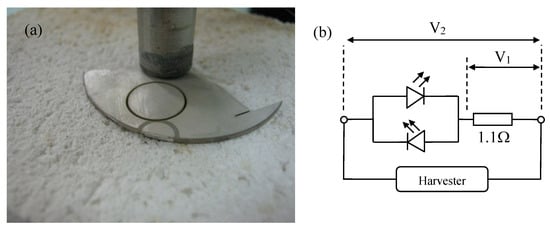 In the above studies, no load was applied to the cutting transducer. In this section, the test was carried out under the real cutting conditions, as shown in Figure 10. A piece of PZT ceramic disk was cut, as shown in Figure 10a. The input voltage of 500 Vpp was applied to the cutting transducer. During cutting, the tip of the cutting transducer was pressed against the ceramic surface. The static force is 2.6 kgf. This static force also generated energy, but it was negelated in the present study. Two LEDs with opposite polarity were used to indicate the energy generation capability of the harvester as shown in Figure 10b. The two LEDs were connected in parallel. As a result, they will light up alternatively. A 1.1 Ω resistor was used to measure the current flowing through the LEDs. Therefore, in Figure 10, V1 is the current to be measured and V2 is the voltage across the LEDs (voltage drop across LEDs is much larger than that of the 1.1 Ω resistor).