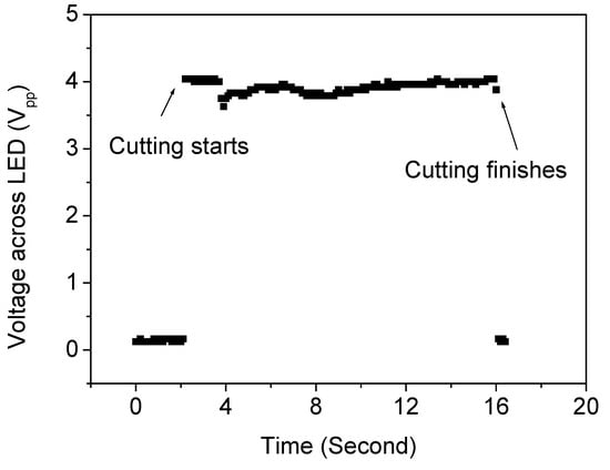 Figure 12 shows the variation of the voltage drop across the LEDs during the cutting process. The cutting depth is 1 mm, which takes a time duration of approximately 14 s. The fluctuation of the signal indicates the variation of the vibration amplitude of the cutting transducer. Therefore, from this signal variation or the brightness of the emitting light, the vibration of the cutting transducer can be qualitatively controlled or monitored.