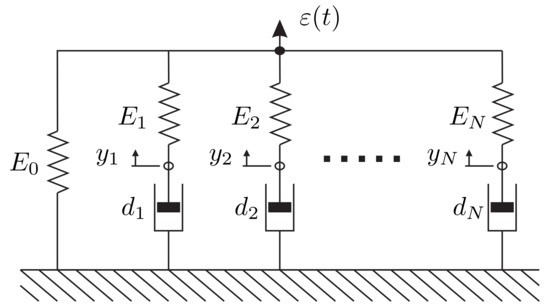 Viscoelastic materials feature a frequency dependent behavior of the stiffness and damping values. To describe the characteristics of such materials often a generalized Maxwell model is used [21,22,23]. As shown in Figure 2, such a model consists of a single spring with the equilibrium modulus and several Maxwell units in parallel. This spring describes the material response after infinite time. Each Maxwell consists of a single spring and a single damper in series, reproducing the frequency dependency by adding different time constants . So a quasi non-linear behavior can be represented by superposing linear elements. For harmonic excitations in the frequency domain a representation of the generalized Maxwell model with a complex modulus