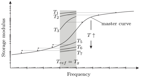 To describe the thermo-viscoelastic behavior usually master curves are used [24]. Thereby, the theory of temperature-time-correspondence is applied to combine measurements at different temperatures and draw conclusions for other frequencies. The basic approach is depicted in Figure 3.