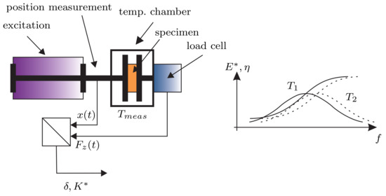 A specimen is excited at different temperatures by harmonic deformation at various frequencies. In the process the reaction force is measured by a load cell. Thereby, the ratio between force and displacement reflects the stiffness of the material. Due to dissipation effects a phase shift occurs between the force and the displacement, which represents the damping capability of the material. The measurement leads to the so-called isotherms. Thereafter, the measured stiffness values [26] have to be converted to the material significant storage modulus and loss modulus using the geometric parameters of the specimen. For a circular specimen with the height and diameter the relation between the measured axial stiffness and the material modulus E is given by