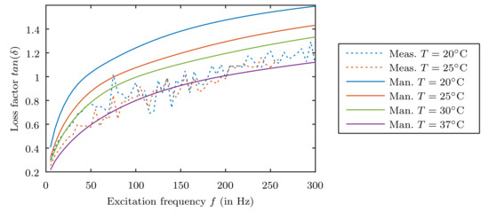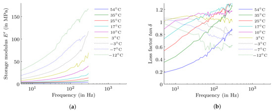 In Figure 5a,b the measured isotherms of a selected butyl rubber with a hardness of Shore A40 are shown. It can be seen that the storage modulus is increasing with lower temperature. However, the loss factor shows, at the beginning, an increase with lower temperature till it reaches a maximum value. Afterwards, the loss factor falls again.