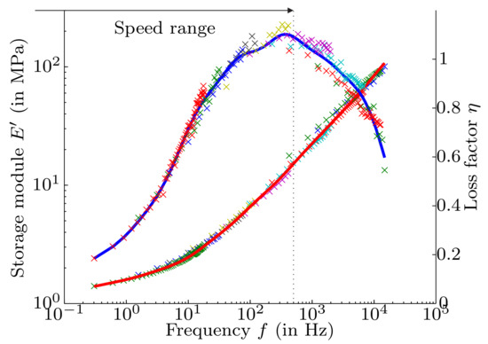 Fitted curves of the storage modulus (red) and the loss factor (blue) in comparison to the measured data (×) at a reference temperature of 25 °C, whereby the different colors mark the various measurement temperatures.