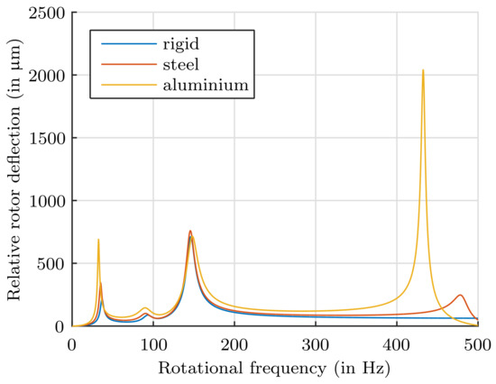 Figure 9 shows the effect of the flexible stator shaft of a designated system for different shaft materials. In the top PMB the deflections in the first resonance at about 40 Hz are increasing with softer material. Furthermore, the bending frequency, which is present in the range of 400–500 Hz is situated in the operation range. The stator shaft material has a huge influence on the relative rotor deflections in the first bending mode. Due to the required space limitation for the AMB, the motor and the position sensor system, the minimum stator shaft length is given with 116 mm as used in Figure 9. As the deflection, due to the bending, cannot be influenced by the stiffness of the PMBs and the stiffness and positioning of the damping elements, the only suitable material for the shaft, that meets the requirements of a maximum deflection in the PMB planes of 500 µm, is steel.