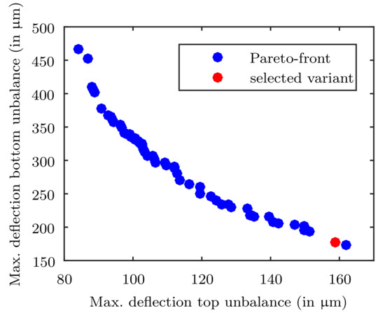 Pareto-front of the optimization referring the maximum deflections arising due to the specified unbalances of 20 gmm.