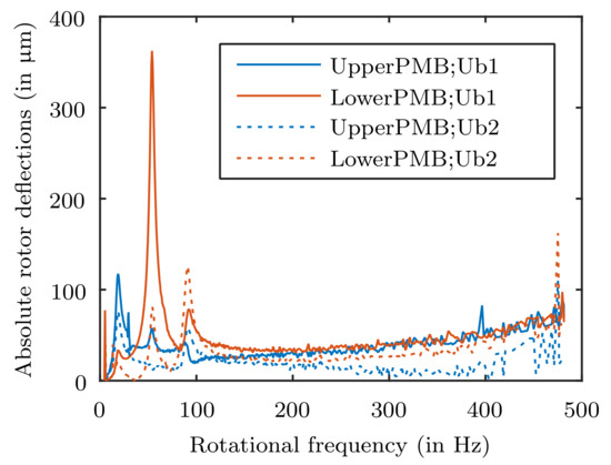 In Figure 11 the measured absolute rotor deflections in the PMB planes (see Figure 1) over to the rotational rotor frequency is shown. It can be noticed that the highest displacement is occuring in the lower PMB due to the unbalance in the upper balance plane. The difference to the low optimized deflections shown in Figure 10 is caused by the lower rotor mass of the verification system as it is measured without the additional mass, which has an negative influence on the system adjustment as shown in [20].