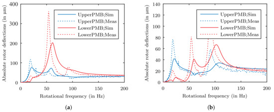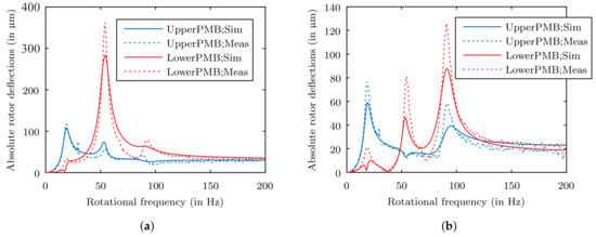 Comparison of the measured data with the simulated deflections with “Unbalance1” (a) and “Unbalance2” (b) specified in Table 4.