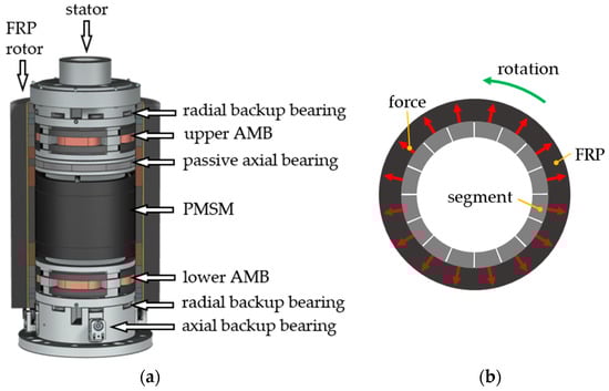 Figure 2a shows a section view of the designed test rig, which was introduced in [11]. A hub and a shaft coupling connected the specimen to the driving spindle. This configuration, rather than an outer-rotor setup, was chosen to protect the active parts of the spindle in case of a failure of the specimen at high speed. Each of the eight segments of the steel ring inside the FRP weighed 1.027 kg, and the distance between their center of gravity (CoG) and the rotation axis is about 55 mm. Hence, at 40,000 rpm one segment contained around 30 kJ of kinetic energy. The surrounding containment was designed to absorb this energy in case of specimen failure. The design criteria for the containment were derived from [12]. The containment also serves as a vacuum chamber. A detailed view of the spindle is shown in Figure 2b. The motor in the middle is a water cooled PMSM with four poles, a maximum torque of 9.6 Nm, and a maximum power of 30 kW. In order to avoid excessive wear of the high-speed drive, the rotor is supported by AMBs. The radial AMBs were designed in a heteropolar configuration with laminated cores on rotor and stator, both made out of 0.2 mm thick sheets of non-oriented silicon steel (NO20). The radial position of the rotor is measured with four eddy current sensors at each bearing, two for each radial direction.