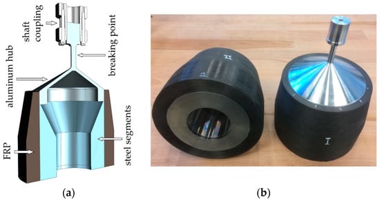 One possible flywheel design is an outer-rotor setup (e.g., [3,4,5]). It promises high energy densities due to the large radii of the rotor and high rotational speeds. A realized full-scale system is described in [6]. A model of the system is shown in Figure 1a. The rotor is a magnetically levitated hollow cylinder. The outside of the rotor is made out of fiber reinforced plastic (FRP) with a circumferential fiber orientation, using carbon fibers. The inside of the rotor consists of different rotor parts of the active and passive components. Active magnetic bearings (AMBs) are used for radial levitation and a passive magnetic bearing is used for axial levitation. A permanent magnet synchronous machine (PMSM) accelerates and decelerates the rotor. All rotating components of the magnetic bearings and the PMSM are integrated on the inner circumference of the FRP rotor. Under rotation, these components press against the FRP, resulting in radial compressive stress transversal to the fiber orientation, which is superimposed by circumferential stress in the fiber direction (see Figure 1b). The energy density of the system increases with the radii of the rotor and its rotational speed, both factors lead to an increased stress in the FRP [7]. Consequently, high stress in the material is necessary to reach high energy densities. Charging and discharging the flywheel leads to cyclically varying mechanical stresses. To investigate the cyclic stability and lifetime of the FRP rotor, cyclic material tests, such as cyclic transverse tensile tests (derived from [8]), cyclic transverse compressive tests (derived from [9]), and cyclic four-point bending tests are performed on material samples. These samples are thin walled and relatively easy to fabricate with a high quality, whereas the rotor of the flywheel is much thicker and harder to produce in an industrial fiber winding process. Furthermore, the thermal expansion of carbon fiber and the epoxy plastic matrix used differ, leading to inner stress when a thick walled FRP structure cools down from the curing temperature. Hence, there is a much higher probability of imperfections and defects in the thick walled FRP structure of an outer-rotor flywheel than in the thin material samples. Therefore, the applicability of test results obtained with thin material samples to the rotor of the flywheel has to be investigated by tests with thick walled rotors. A specialized test rig was designed and set up to perform cyclic tests on thick-walled FRP specimens, which represent the outer-rotor of kinetic energy storage. These specimens are smaller, cheaper and have a lower energy content, reducing the danger during destructive testing.