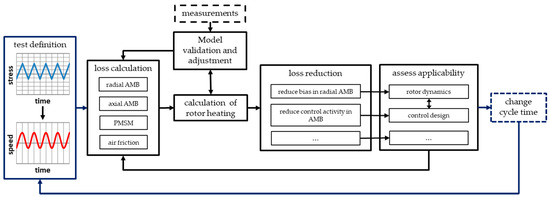 The following sections discuss the loss calculation of the active magnetic bearings for the radial and axial direction and the electric machine, as well as losses caused by air friction. Subsequently, the thermal model focusing on the rotor temperature is described. For the model validation and potential adjustment, the calculation results are compared with measurements.