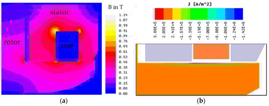 (a) Magnetic flux density in the axial active magnetic bearing (AMB); (b) Current density in the surface area of the thrust disk during switching of the axial AMB.