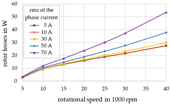 Results for different phase currents and rotational speeds are shown in Figure 7. The losses increased nearly linearly with the speed above 10,000 rpm. For root mean square values of the phase current (rms) below 10 A, losses were nearly independent of the phase current.
