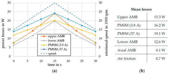 (a) Rotational speed and calculated rotational losses of the active components during one cycle; (b) Resulting mean losses of all calculated loss mechanisms in the rotor during cycling.